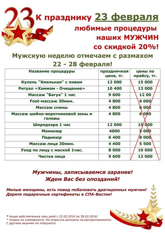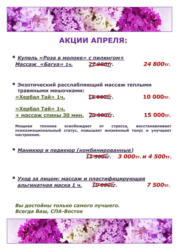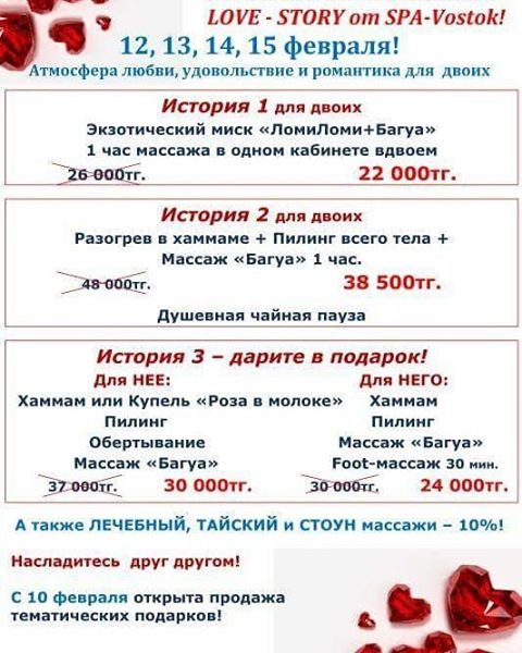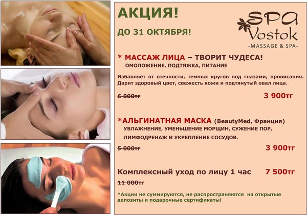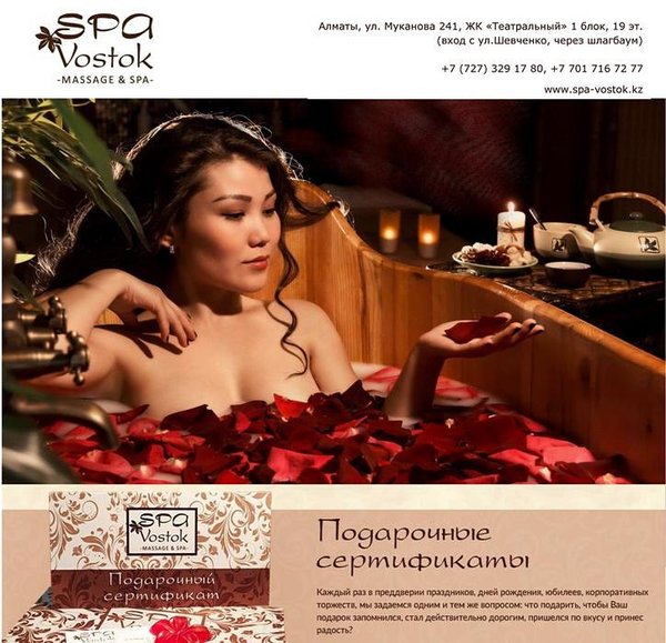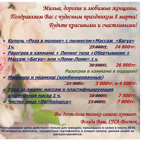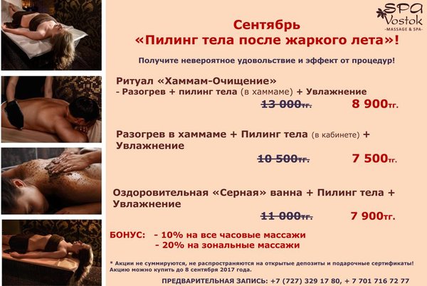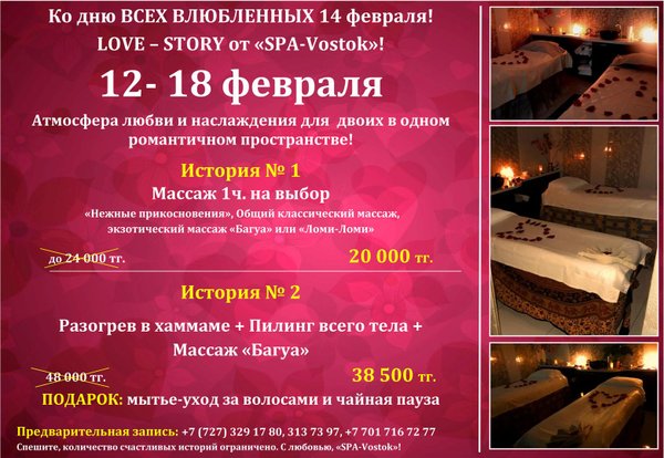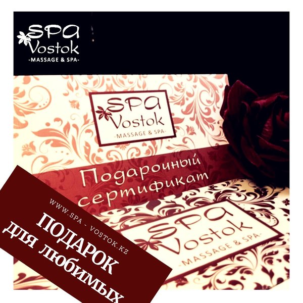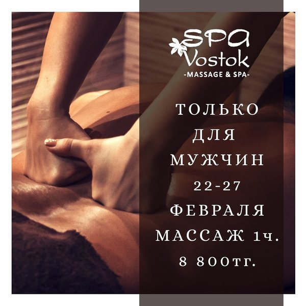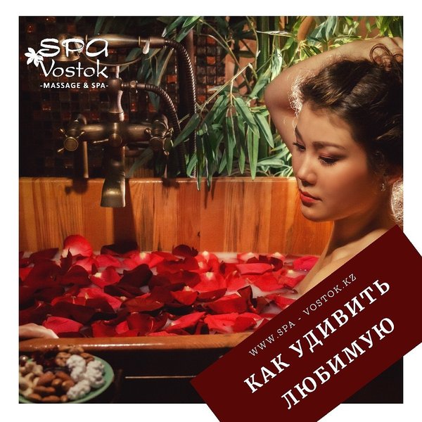 пание. — Мытье головы массажными движениями. — Чайная пауза. — Массаж 1 час на выбор (Экзотический массаж “Багуа”, Общий Классический массаж, Relax-массаж «Нежные прикосновения»). 2 – 2.5 часа 40 000 тг. вместо 52 000 тг. Выгоднее на 12 000тг. Дополнительно по Вашему желанию: + Фирменный подарок – мыло ручной работы 1шт. 2 000тг. + Букет шикарных роз 7 000тг. + Бутылка шампанского 5 000тг. * Внимание! Предложение является инициативой салона «SPA-Vostok» и не распространяется на подарочные сертификаты. Действует только при оплате наличными или банковской картой всей суммы. * Внимание! Акции салона и специальные скидки не действуют, если Гости записываются на 20.00 и позже. Запись: