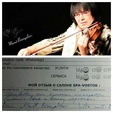 Наталья Ермакова (25.03.2016): Сегодня у нас в СПА-Восток был знаменитый Гость — Марат Саметович Бисенгалиев известныйказахстанский скрипач — виртуоз и дирижер. Заслуженный деятель РК и потрясающий человек! Очень рады были угодить и благодарим за отзыв!