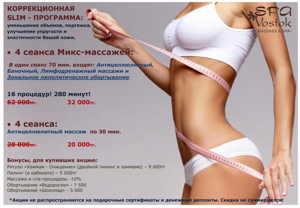 КОРРЕКЦИОННАЯ SLIM — ПРОГРАММА со СКИДКАМИ! ВПЕРЕД К ЖЕЛАННОЙ ФИГУРЕ: — подтяжка силуэта — уменьшение объемов — улучшение упругости и эластичности кожи Выбирайте свой вариант для Вашей красоты! I вариант Интенсивная РАБОТА С ПРОБЛЕМНЫМИ ЗОНАМИ: 4 сеанса по 70 минут Состав: Антицеллюлитный массажа, Баночный массаж, Лимфодренажный массаж, Зональное липолитическое обертывание 32 000тг. вместо 62 000тг. II вариант РАБОТА С ПРОБЛЕМНЫМИ ЗОНАМИ: Живот&Бока или Бедра&Ягодицы 4 сеанса по 30 минут Состав: Антицеллюлитный массаж 20 000тг. вместо 28 000тг.… — Читать дальше