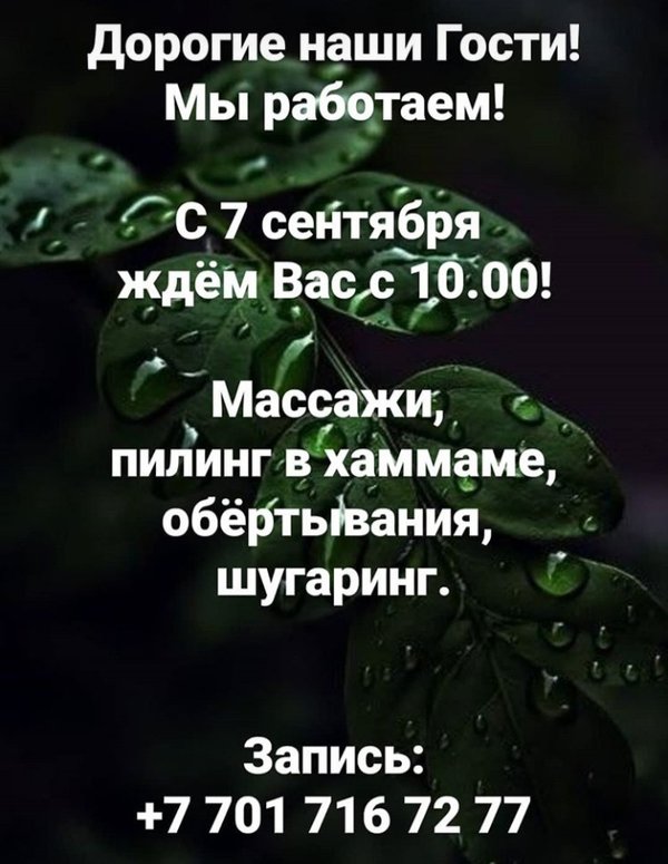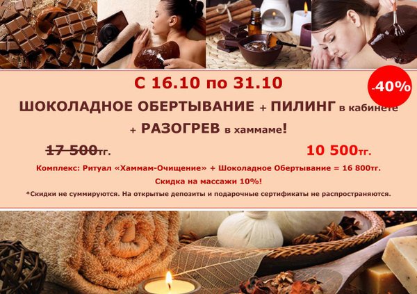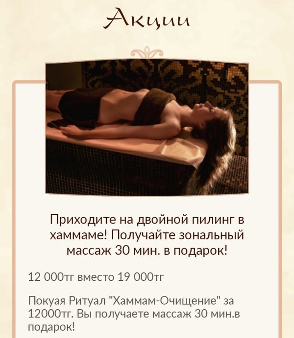 Специальное предложение действует до 30 ноября! Покуая, Ритуал «Хаммам-Очищение» за 12000тг. Вы получаете массаж 30 мин.в подарок! Массаж 30 мин. любой зоны на Ваш выбор (спина, голова, шейно-воротниковая зона, Foot-массаж). Спешите, телефон для записи:,.
