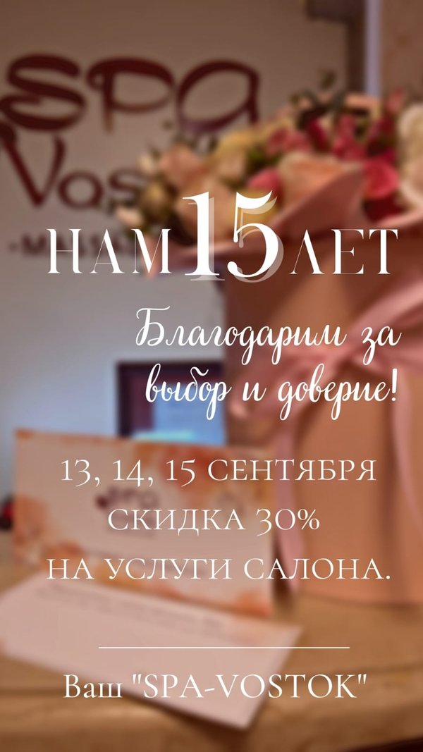 Нам 15 лет! С 13 по 15 сентября приглашаем на наш День Рождения! Дарим скидки 30% на процедуры салона! Условия действия скидки: 1. Приобрести услуги со скидкой можно только 13, 14, 15 сентября. 2. Скидки не суммируются. 3. Стоимость считается от начальных цен процедур, указанных в прайсе. 4. Воспользоваться можно в течение 1 месяца со дня приобретения. 5. Подарочные сертификаты со скидкой действуют 1 месяц. 6. Акция не распространяется на приобретенные ранее подарочные сертификаты. КУПИТЕ МАССАЖИ ДЛЯ СЕБЯ И СВОИХ БЛИЗКИХ В ПЕРИОД СКИДОК И ПОСЕТ… — Читать дальше