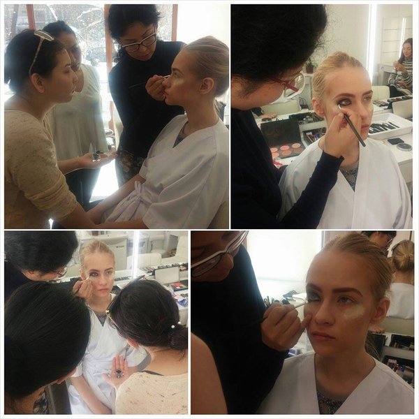 Чтобы подчеркнуть зеленые глаза ученица Кабдиева Гулим использовала фиолетовую подводку #inglotkazakhstan на подвижном веке модели, также для экстравагантности была нанесена фиолетовая помада этого же бренда.