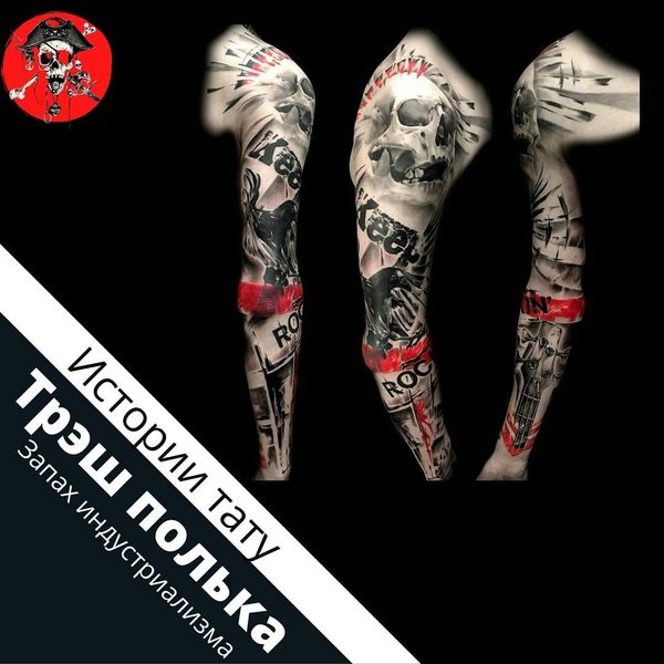 фольклоре. В этом признавались его создатели. В частности, название Trash Polka — это не что иное, как отсылка авторов к цыганскому и немецкому фольклору. Хотя стиль молодой, он в некотором роде уже устоявшийся. Но при этом — постоянно развивающийся. Современные мастера продолжают вносить в него какие-то свои идеи. Стиль треш полька «родилсь» из фотографий, коллажей, газетных вырезок. Этот «хлам» служил для двух основателей — татуировщиков-экспериментаторов — основой, поверх которой они делали свои рисунки. Спустя время выработался стиль, оформились черты. К ним относится, например, использование мрачных образов. Череп — один из постоянных «спутников» татуировок в стиле трэш полька. Но, например, если в орнаментале он «нейтрален», насколько это возможно, то здесь часто выражает ужас, боль, отчаяние. Эта и другая символика «рождает» страшные нательные картины. Хотя для них может быть характерна и злая ирония, в целом остается довольно гнетущее впечатление.