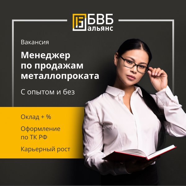 ь. Тем, у кого уже есть опыт работы в продажах металлопроката, мы готовы предложить индивидуальные условия при личной встрече. Условия: • оклад 40 000 рублей на испытательном сроке + высокий% от продаж; • испытательный срок 1–3 месяца в зависимости от результатов работы. После его прохождения оклад обсуждается индивидуально; • выплаты без задержек; • пятидневная рабочая неделя 9:00–18.00; • обучение номенклатуре металлов, навыкам продаж, психологии общения и личной эффективности за счет компании; • программа адаптации и наставничества для новых сотрудников; • дружелюбный и молодой коллектив, насыщенная корпоративная жизнь. Среднемесячный доход менеджера после 3–4 месяцев работы при выполнении плановых показателей – от 120 000 рублей. Нет потолка и ограничений для роста з/п. Обязанности: • прием и обработка входящих звонков и заявок, создание или расширение собственной базы клиентов; • консультирование по ассортименту компании, предоставление ценовых предложений; • проведение деловых переговоров, презентаций, встреч; • полное сопровождение каждой сделки и ведение документооборота по сделкам; • заключение договоров, контроль оплаты счетов. Контакты для связи: Манзурова Юлия E-mail: msk-hr@bvbmail.ru Моб. телефон: Телефон:, доб. 403