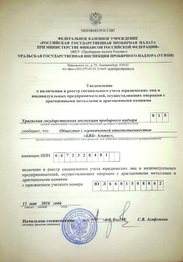 Компания «БВБ-Альянс» включена в реестр компаний, осуществляющих операции с драгоценными металлами.
