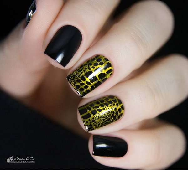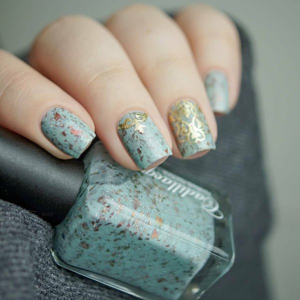 Сейчас выпускают такие интересные лаки, что подобрать к ним компаньона — тот еще квест. Но разнообразить и усложнить иногда хочется даже очень навороченные композиции, и тут нужно либо эстетическое чутье, либо знание секретных законов сочетаемости. Например здесь золотой слайдер поддерживает самое слабое звено лака — едва уловимую мелкую пыльцу. В результате (а еще потому, что узор выбран тонкий и лаконичный) этот насыщенный маникюр не выглядит перегруженным.