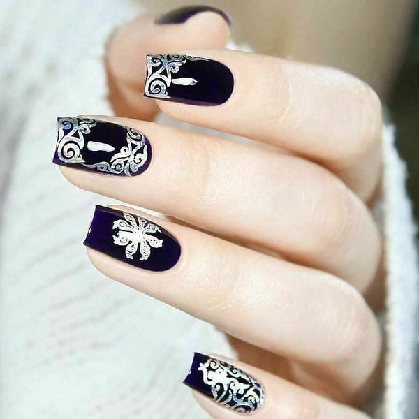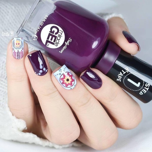 Эти ногти как будто только что из типографии — лакированный графичный рисунок притягивает внимание и восхищает! Кстати, как вам кажется, что здесь следует считать акцентом — слайдеры или красивейший сливовый лак?