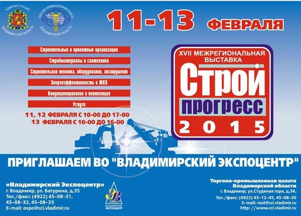 С 11 по 13 февраля во Владимирском Экспоцентре (улица Батурина, дом 35) пройдёт специализированная выставка Стройпрогресс-2015. На ней будут представлены новые разработки в области проектирования и строительства, современные стройматериалы, техника и оборудование