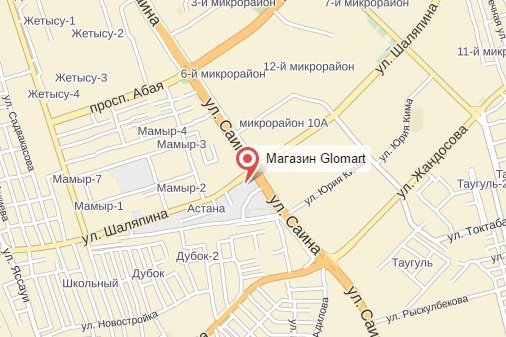 Адрес магазина Glomart: Казахстан, Алматы, Ауэзова, 50.