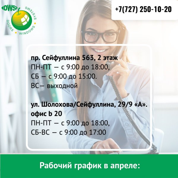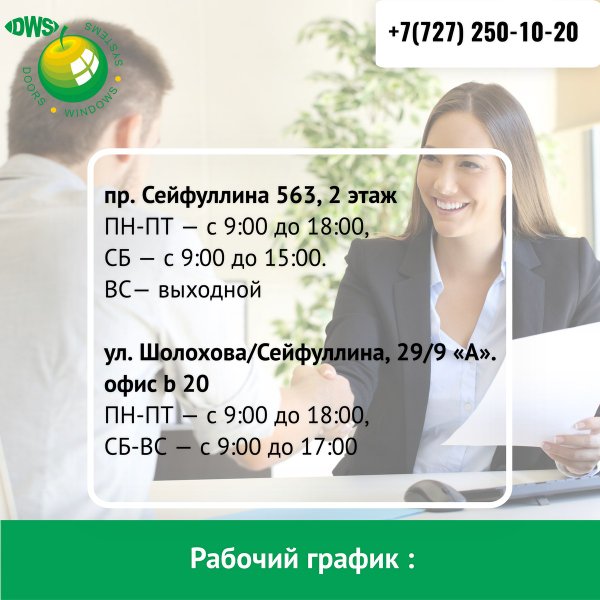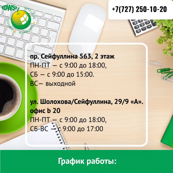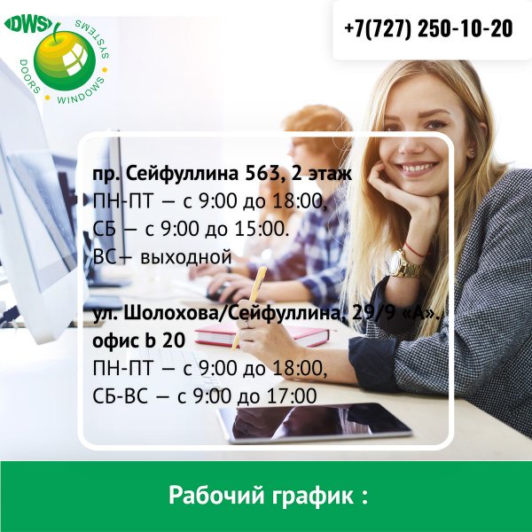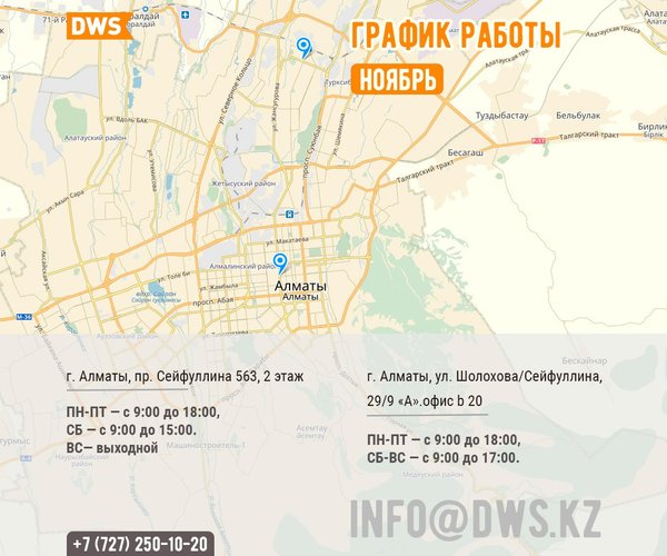 а 563, 2 этаж ПН-ПТ — с 9:00 до 18:00, СБ — с 9:00 до 15:00. ВС — выходной г. Алматы, ул. Шолохова/Сейфуллина, 29/9 «А», офис b 20 ПН-ПТ — с 9:00 до 18:00, СБ — с 9:00 до 15:00. ВС — выходной г. Алматы, ул. Богенбай батыра 102/58, уг. ул Пушкина ПН-ПТ — с 9:00 до 18:00, СБ — с 9:00 до 15:00. ВС — выходной