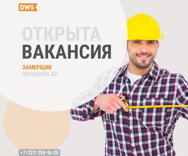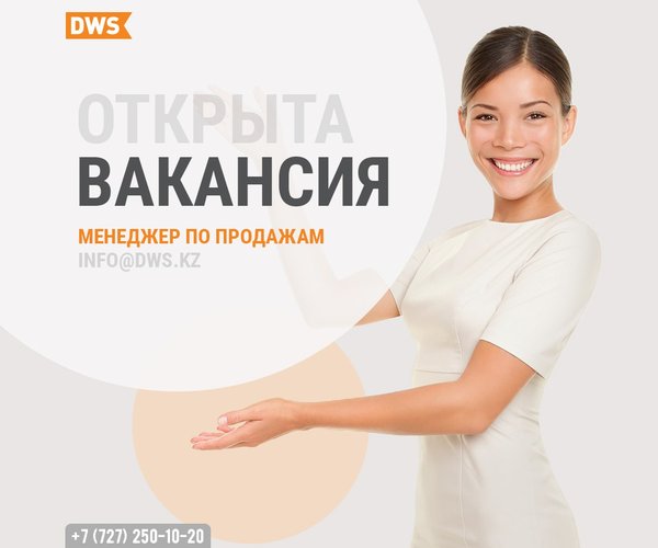 ОТКРЫТА ВАКАНСИЯ! В коллектив нашей компании приглашаем МЕНЕДЖЕРА ПО ПРОДАЖАМ УСЛОВИЯ: — полная занятость — график работы: по согласованию — оклад + проценты с продаж (обговаривается при собеседовании) ТРЕБОВАНИЯ: — ответственность — возраст от 22 лет — опыт работы в сфере продаж — пунктуальность — хорошие коммуникативные навыки — уверенный пользователь ПК и интернет резюме отправлять на email: info@dws.kz