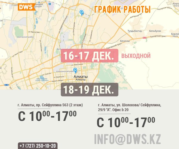 . ВС — выходной г. Алматы, ул. Богенбай батыра 102/58, уг. ул Пушкина ПН-ПТ — с 9:00 до 18:00, СБ — с 9:00 до 15:00. ВС — выходной