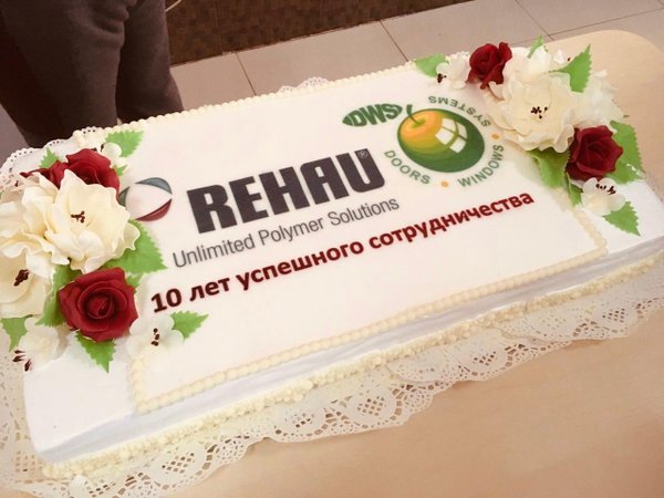В честь успешного 10 летнего сотрудничества вот так нас поздравляли представители коллег-партнеров REHAU из Москвы и Казахстана. Ну и какой же юбилей без торта?