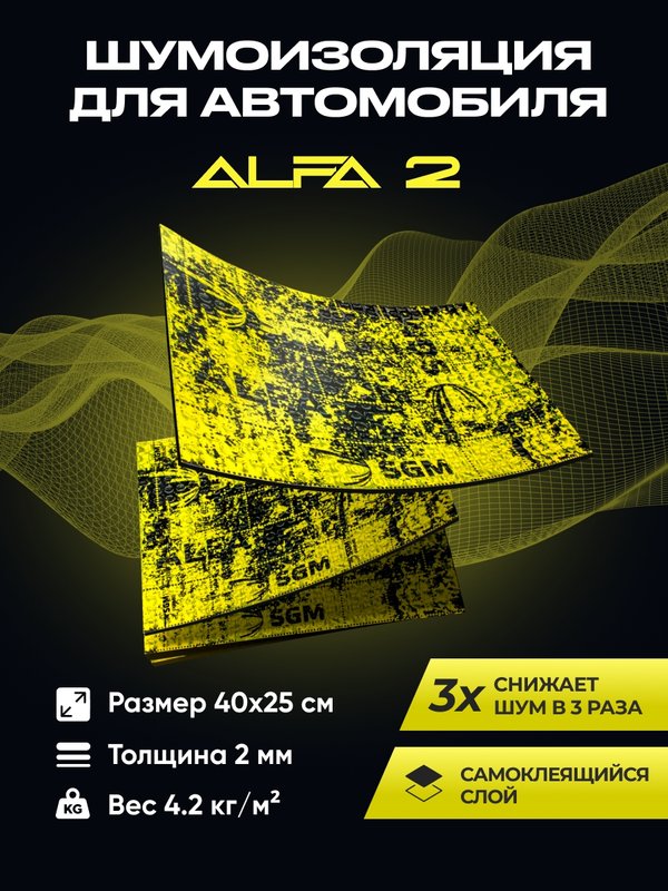 SGM Альфа 2 — это уникальный виброизоляционный материал для шумоизоляции автомобиля, обладающий высокими показателями коэффициента механических потерь даже при минимальной толщине, выступает гарантом защиты кузова от коррозии и служит хорошей основой для подготовки автомобиля к улучшению акустической системы.