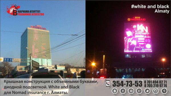 Крышная конструкция с объемными буквами, диодной подсветкой. White and Black для Nomad insurance г. Алматы.