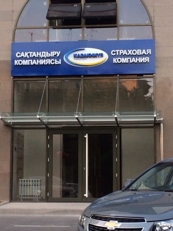 Световая вывеска с объемными буквами (12х2,6 метров), аэропорт г.Алматы. Изготовлено для страховой компании «Kompetenz».