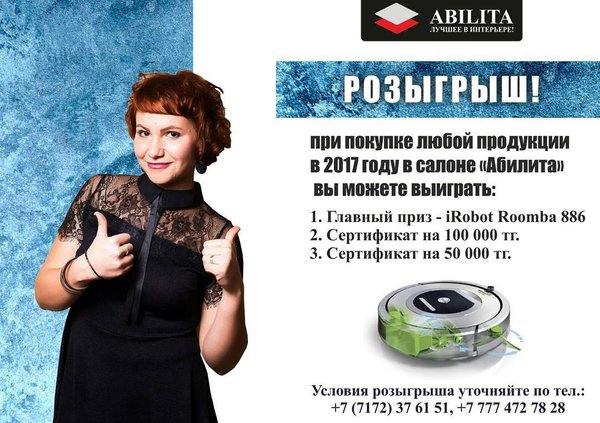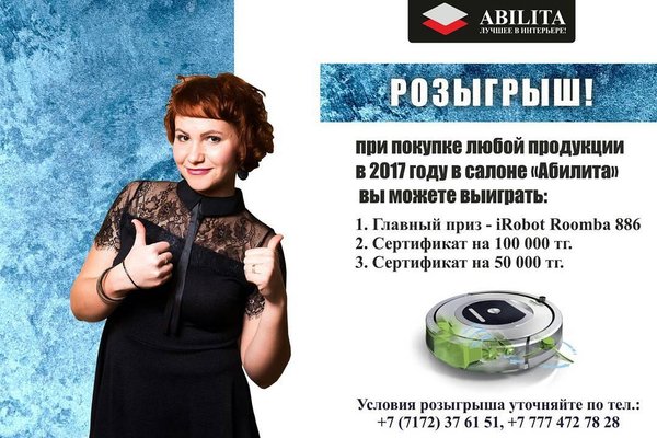 ДОРОГИЕ ДРУЗЬЯ! Мы запустили АКЦИЮ в салоне «АБИЛИТА». УСЛОВИЯ РОЗЫГРЫША: 1. При покупке любой продукции в 2017 году в салоне Абилита в городе Астана Вы имеете возможность стать участником розыгрыша 2. Победители будут выбраны путем лотереи 3. Результаты будут зафиксированы на видео при независимых участниках в кол-ве 10 человек и размещены на официальном сайте 4. Розыгрыш состоится 7 декабря 2017 года в салоне Абилита по адресу: г.Астана, ул. А. Янушкевича, 1, НП-9 5. Приз и сертификат нельзя обменять на денежный эквивалент 6. Розыгрыш проводи… — Читать дальше