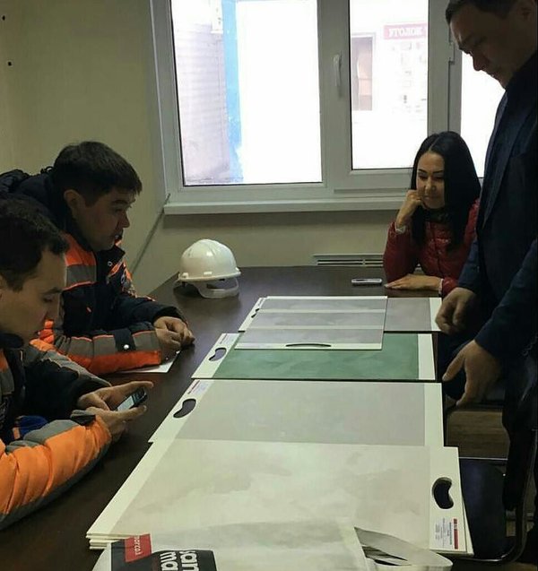 Рабочие моменте на строительном обьекте. Утверждаем образцы.