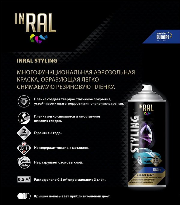 в. Подходит для изменения цвета автомобиля и его защиты от повреждения и загрязнения. • Гарантия покрытия 2 года. • Цветовая палитра: белый, серый, чёрный. • Торговая марка InRAL. • Made in EU (Европа).