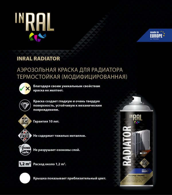 ии длительного времени оставаться по-прежнему белой. • Так как краска не обладает резким запахом, то она подходит для окрашивания поверхностей в помещении. • Удобна для окрашивания трубнодоступных мест – аэрозоль закрасит там, где кисточка не достанет. • Время высыхания около 20 часов. • Торговая марка InRAL. • Made in EU (Европа).