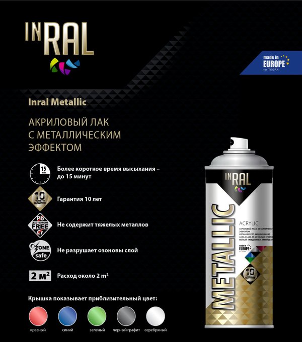 Лак универсальный METALLIC: Металл, дерево, камень, стекло, керамика, бумага, картон, жёсткий пластик – красит всё, что Вы можете вообразить. По-настоящему универсальная аэрозоль! • яркие, насыщенные цвета с эффектом металлик: красный, синий, зелёный, серебро, чёрный матовый! • образует эластичный и крепкий верхний слой. • ускоренное время высыхания – всего 15 минут. • не нарушает озоновый слой. • не содержит тяжёлых металлов. Расход 1 баллона на 2 квадратных метра. Торговая марка InRAL. Made in EU (Европа).