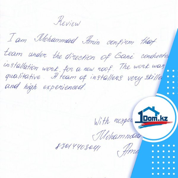 Очередной отзыв от довольных клиентов нашей компании I am Mohammad Amin confirm that team under the direction of Gani conducted installation work for a new roof. The work was cualitative. A team of installers very skilled and high experienced. With respect, Mohammad Amin.