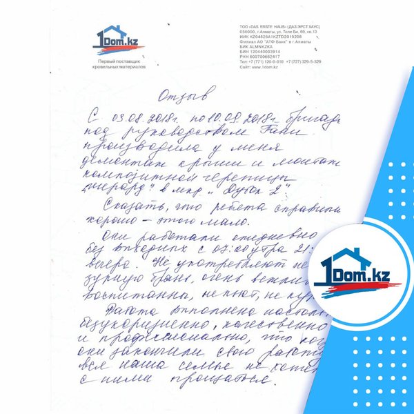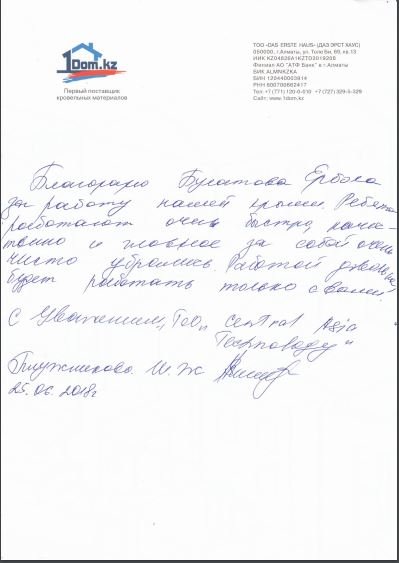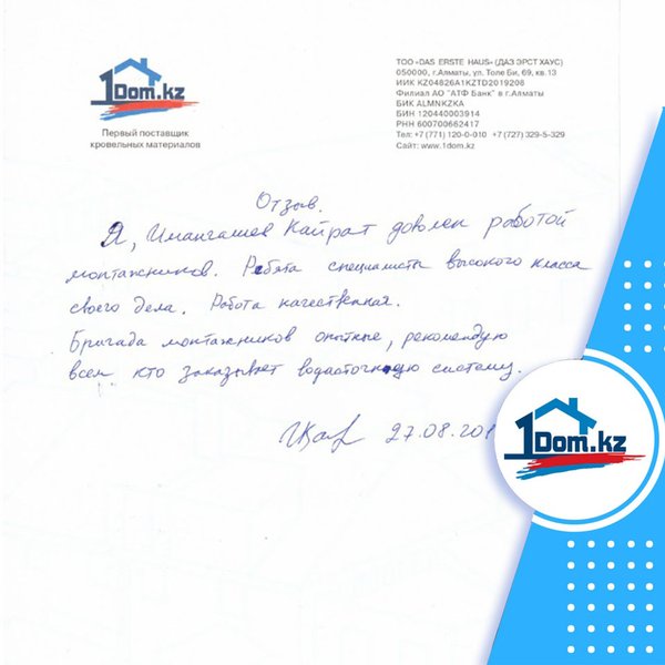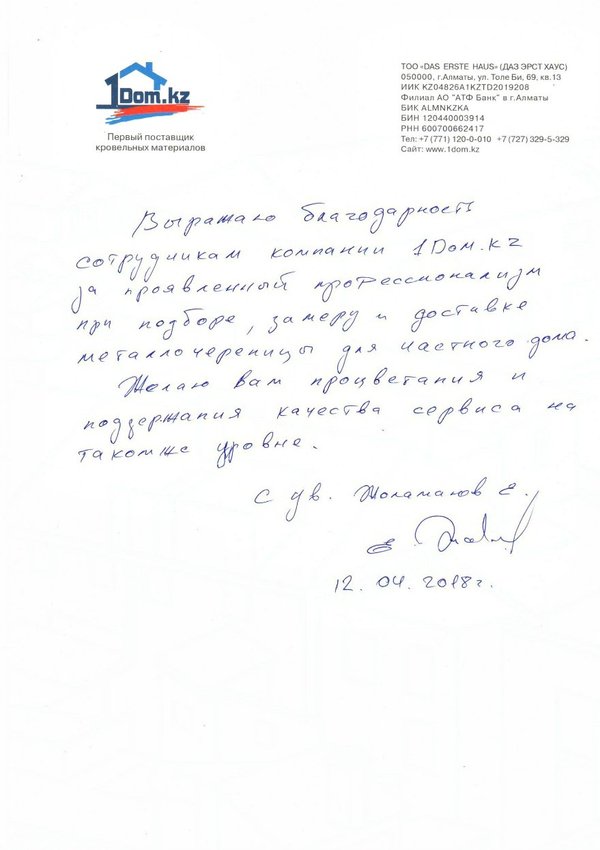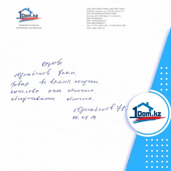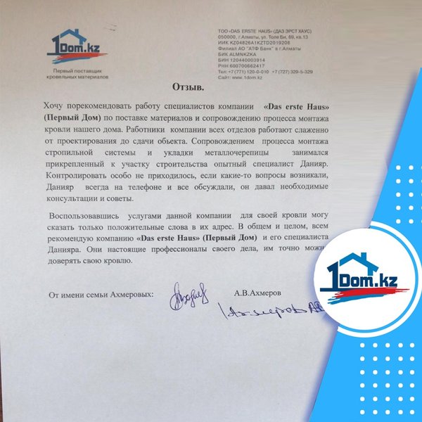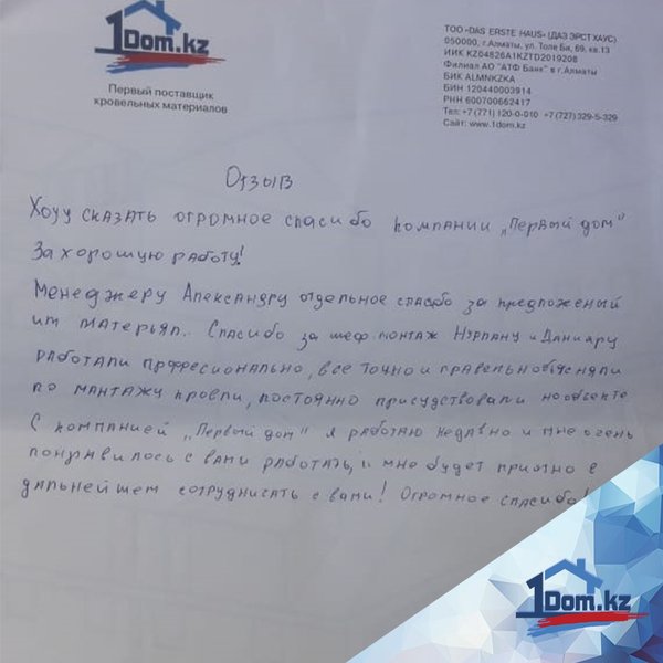 Очередной отзыв от довольных клиентов нашей компании Я, Нусипбеков Марлен Даулетович Хотел выразить признательность ТОО «Das erste Haus» за оказанную квалифицированную помощь при выборе, монтаже кровли. Менеджер Олег профессионально и доступно оказывал обратную связь, за это я ему благодарен. Желаю вашей компании процветания и благополучия, а так же миллионы благодарных клиентов. с Уважением. 23.10.2018