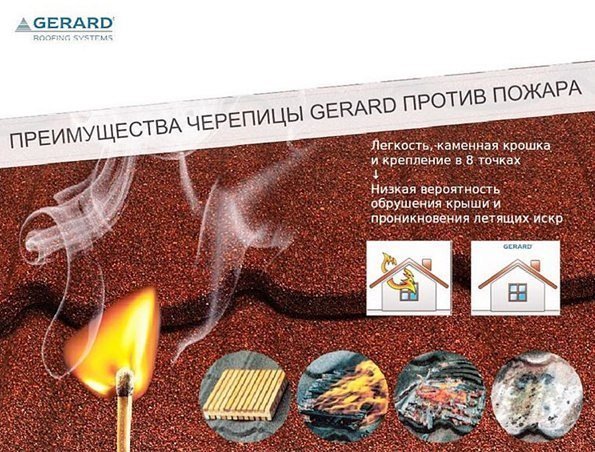 Устойчивость композитной черепицы GERARD к возгоранию При пожаре дом может обрушиться под весом кровли. Но только не с кровлей GERARD. Кровельная система GERARD устойчива к возгоранию. Наша кровельная система устойчива к возгоранию, поскольку стальное основание не воспламеняется и предотвращает распространение пламени. Каждый лист черепицы имеет 8 точек крепления, а значит, крыша не может обрушиться, а искры не смогут проникнуть в дом. Наши кровли выдержали международные испытания на огнестойкость.