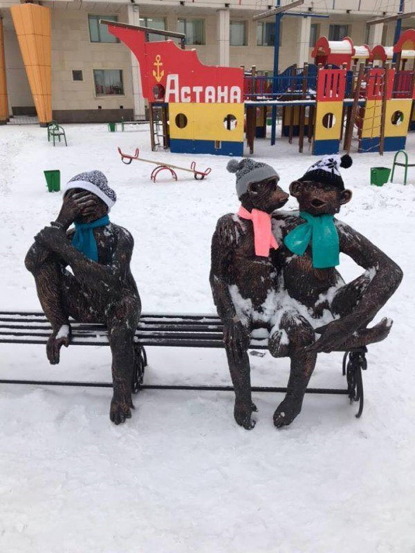 Скульптуры в Астане одели по-зимнему «По прогнозу погоды несколько дней будет снег, и городские персонажи напоминают вам о необходимости одеваться теплее!!!» — написал в Facebook Арман Турлубек.