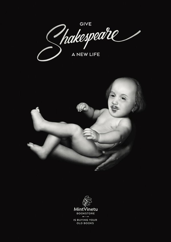 Реклама книжного магазина «Mint Vinetu» в Вильнюсе с призывом покупать книги известных авторов, давая тем самым им новую жизнь.