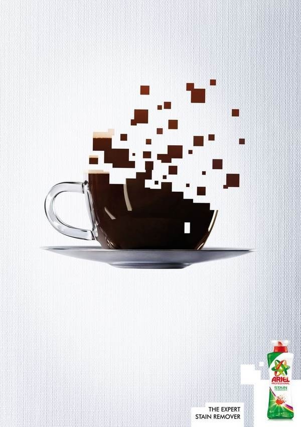 Реклама средства для стирки «Ariel Pro», которое легко удаляет пятна кофе.