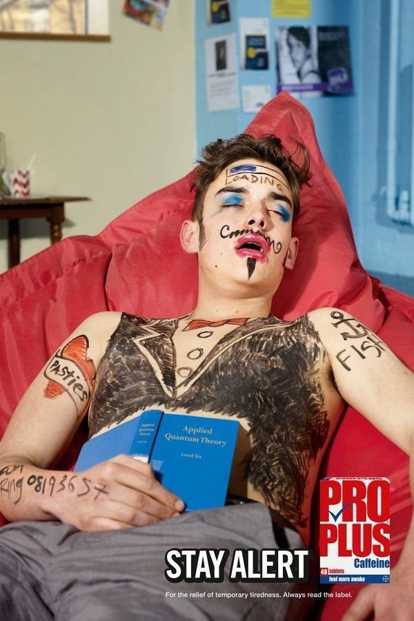 Реклама таблеток с кофеином «Pro Plus»: «Будь начеку».