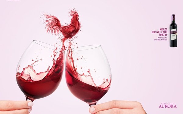 Реклама вина Мерло, которое хорошо подходит к блюдам из птицы.
