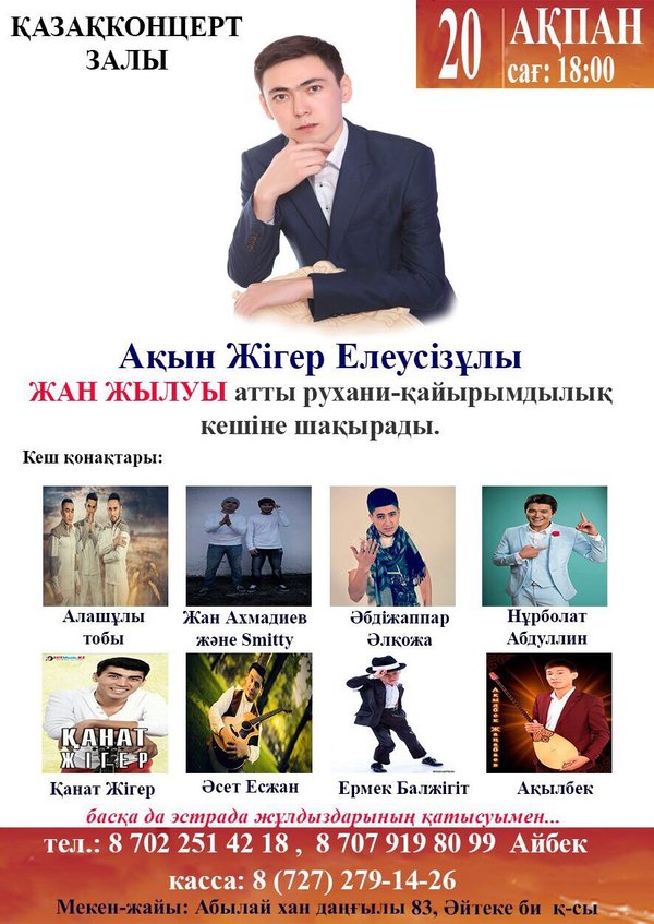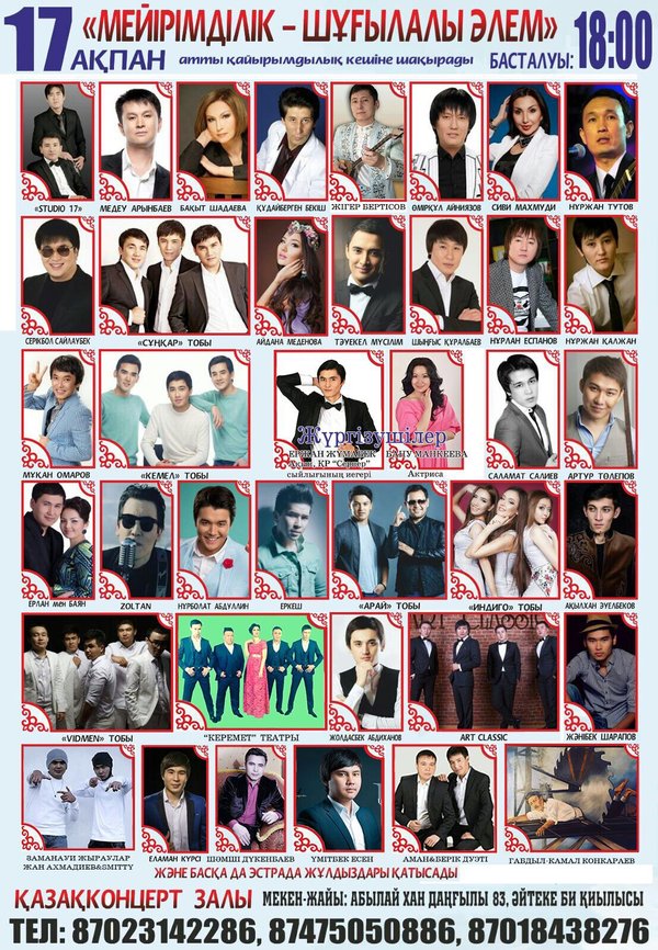 Ақпанның 17-күні, Алматы қаласы, «Қазақконцерт» залында, сағат: 18.00 қайырымдылық кешіне шақырамыз! Концертке «Заманауи Жыраулар» тобы да қатысады. WhatsApp WhatsApp
