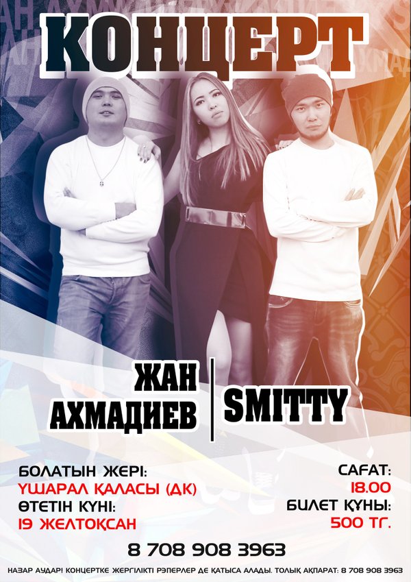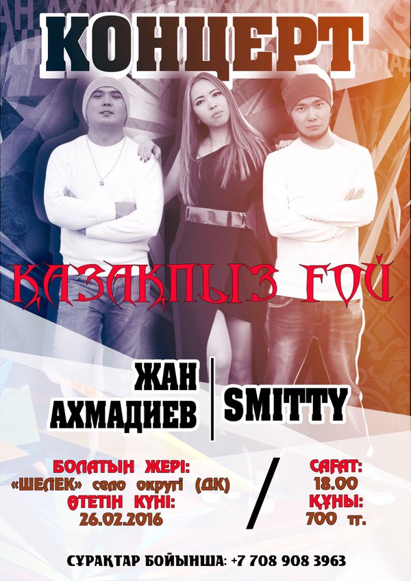 ЖАН АХМАДИЕВ пен Smitty «ҚАЗАҚПЫЗ ҒОЙ» атты концертіне шақырады! БОЛАТЫН ЖЕРІ: ҮШАРАЛ ҚАЛАСЫ | МӘДЕНИЕТ ҮЙІ УАҚЫТЫ: 19.12.2015 ж. | САҒ.: 18.00 НАЗАР АУДАР! КОНЦЕРТКЕ ЖЕРГІЛІКТІ РЭПЕРЛЕР ДЕ ҚАТЫСА АЛАДЫ. ТОЛЫҚ АҚПАРАТ: Концерт, студия звукозаписи, выступления, фит: