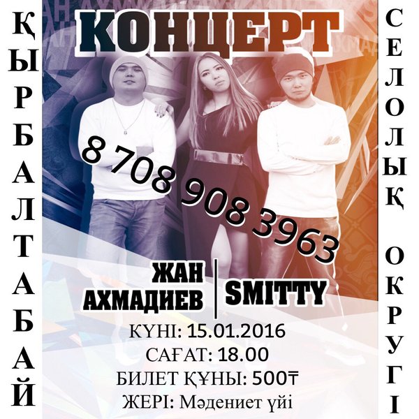 ЖАН АХМАДИЕВ x Smitty «Қазақпыз ғой» атты концерт! Өтетін жері: «Қырбалтабай» селолық округі, мәдениет үйі (Алматы обл.) Болатын күні: 15.01.2016 Сағат: 18.00 Билет құны: 500