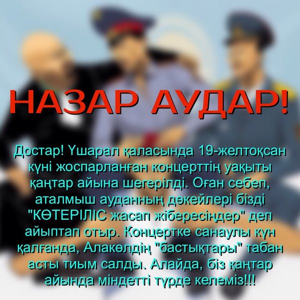 Достар! Үшарал қаласында 19-желтоқсан күні жоспарланған концерттің уақыты қаңтар айына шегерілді. Оған себеп, аталмыш ауданның дөкейлері бізді «КӨТЕРІЛІС жасап жібересіңдер» деп айыптап отыр. Концертке санаулы күн қалғанда, Алакөлдің «бастықтары» табан асты тыйым салды. Алайда, біз қаңтар айында міндетті түрде келеміз!!!