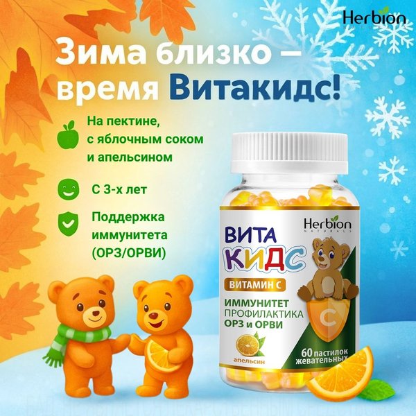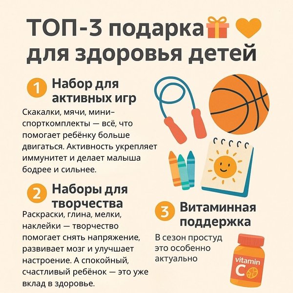 роение. А спокойный, счастливый ребёнок — это уже вклад в здоровье 3⃣ Витаминная поддержка В сезон простуд это особенно актуально. Витакидс Витамин С Апельсин — вкусный помощник для иммунитета: Укрепляет защитные силы организма Помогает в профилактике ОРЗ и ОРВИ Подходит детям от 3 лет Натуральный источник витамина С с приятным апельсиновым вкусом Подарки, которые заботятся — самые ценные. Сделайте этот сезон не только радостным, но и здоровым!