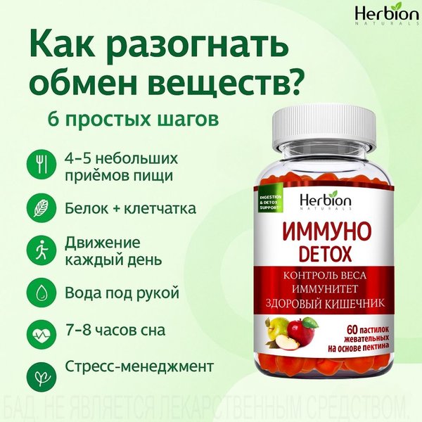 бутылку под рукой — стакан с утра, затем по чуть-чуть в течение дня Сон и стресс-менеджмент. 7–8 часов сна, дыхательные практики или вечерняя прогулка. — Натуральная поддержка. Жевательные пастилки ИММУНО ДЕТОКС : Поддерживают обмен веществ Помогают контролировать вес Источник фолиевой кислоты и витамина B12 Удобны — не нужно запивать, просто жевать Мини-опрос Как Вы поддерживаете метаболизм? 1⃣ Слежу за питанием 2⃣ Двигаюсь ежедневно 3⃣ Пью больше воды 4⃣ Использую натуральные добавки Напишите цифру (или свой способ) — Ваш опыт может вдохновить других Пусть энергии хватает на всё важное — бережно к себе, шаг за шагом Можно приобрести на OZON или Flip