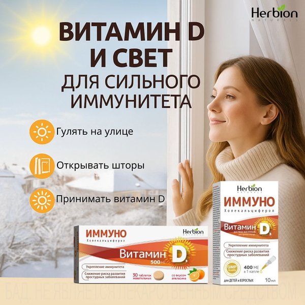 Витамин D и свет для сильного иммунитета Холод, плотный график, короткий день — всё это постепенно «съедает» силы. Витамин D и дневной свет работают как естественные иммуномодуляторы: помогают организму лучше противостоять сезонным инфекциям. Полезно: Проводить больше времени на свежем воздухе Не задвигать шторы и ловить каждый луч Добавлять витамин D в ежедневный рацион В этом помогает Иммуно Витамин D3 от Herbion: Жевательные таблетки и масляный раствор Апельсиновый вкус Укрепление иммунитета Поддержка костей и зу… — Читать дальше