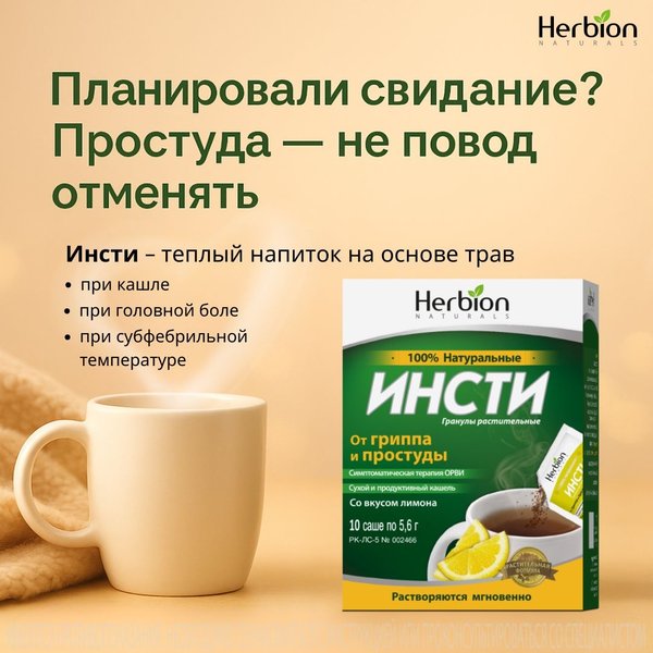 м в борьбе с кашлем Гранулы просто растворяются в тёплой воде — получается горячий напиток с травами, который удобно выпить дома или взять с собой в термосе. Инсти — доверьтесь силе трав при простуде.