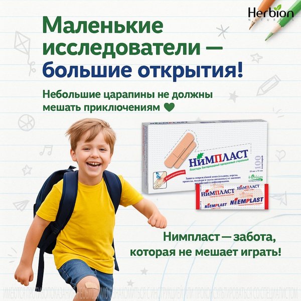 , даже если ребёнок в движении весь день. Пропитка антисептиком помогает защитить от микробов, пока организм делает своё дело. Надёжно держится, но легко снимается — без боли, без липких следов и без “ай!”. Нимпласт — это забота, которая не мешает бегать, прыгать и познавать Он подходит для школьного рюкзака, домашней аптечки и даже для учительского “набора первой помощи”. Пусть каждый синяк станет просто историей о смелости, а каждая царапинка — напоминанием, как интересно быть школьником-исследователем