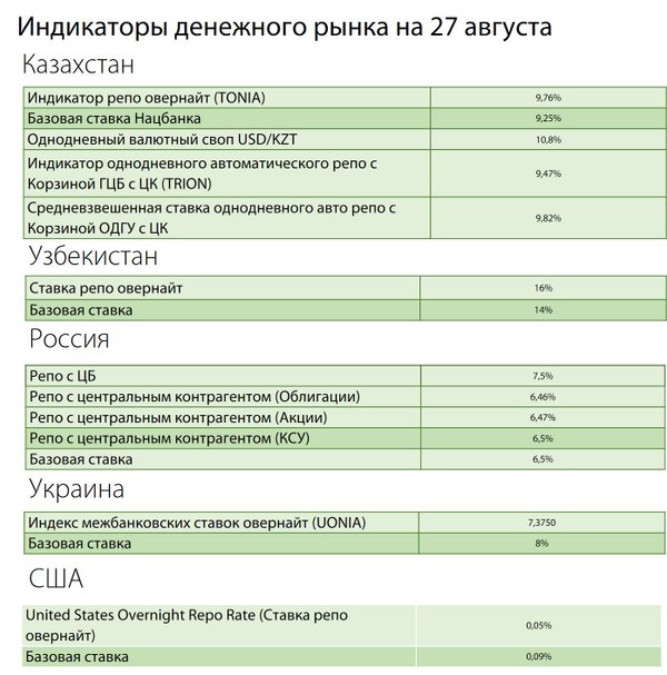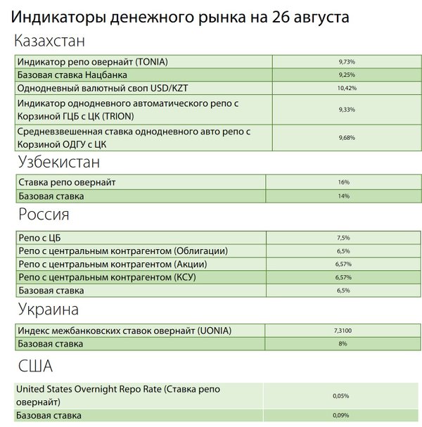 ℹ«Курсив» отслеживает наиболее важные ставки денежного рынка – иными словами, стоимость «коротких» денег в экономике Казахстана, Узбекистана, России, Украины и США.