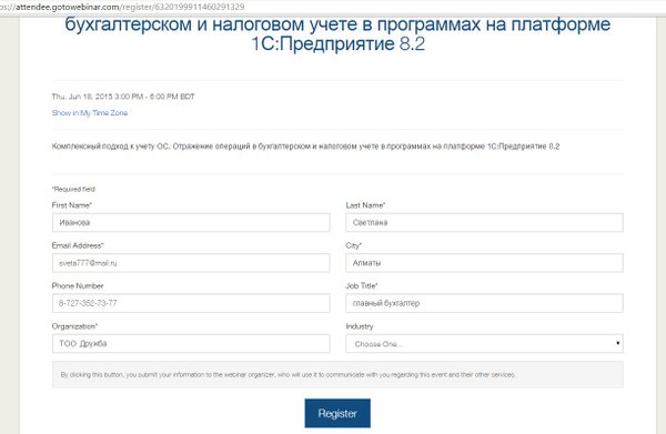 Бесплатный вебинар для Бухгалтеров! Приглашаем Вас принять участие в бесплатном вебинаре «Комплексный подход к учету основных средств. Отражение операций в бухгалтерском и налоговом учете, в программах на платформе 1С:Предприятие 8.2.» Время проведения с 15.00 до18.00 (время Астаны) Дата проведения: 18 июня 2015 года. Для регистрации на семинар пройдите по ссылке Подробная информация по телефонам:; 390-22-11; 394-80-22 Образец регистрации: