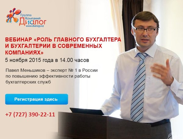«Роль главного бухгалтера и бухгалтерии в современных компаниях» получили в подарок от Павла Меньшикова 1 час бесплатных консультаций в вопросах организации работы бухгалтерии. Тем кому интересно узнать больше о насущных вопросах, предлагаем посетить двухдневный семинар Павла Меньшикова, который пройдет в Алматы 03—04 декабря. Объявляем об акции. Скидка 20% на семинар «Бухгалтерия без авралов и упреков» каждому слушателю при условии подачи заявки на участие до 18:00 06 ноября 2015года. Более подробно о семинаре Оформить заявку Вы сможете пройдя по ссылке