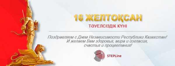 Дорогие Казахстанцы‼ — Примите самые теплые и искренние поздравления с наступающим праздником – Днем Независимости Республики Казахстан ️ Желаем мира и согласия в ваших семьях, крепкого здоровья, счастья и благополучия!‼ — Режим работы офиса и магазина ТОО «STEPLine» в праздничные дни : 14 декабря — магазин работает с 10.00 до 16.00 15—16 декабря: выходные дни 17 декабря, вторник, с 10.00 до 16.00. С праздником! ️