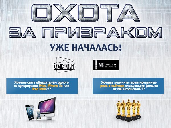 РАЗГАДАЙ СЕКРЕТ ПРИЗРАКА И ВЫИГРАЙ ПРИЗЫ!!! ВНИМАНИЕ!!! Охота за ПРИЗАМИ уже началась!!! В фильме «Охота за призраком» зашифровано таинственное послание, состоящее из 24 слов и знаков. Тот, кто сможет разгадать данное послание первым, получит приз: iMac. Тот кто отгадает вторым: iPhone 5s. Третьим: iPAD mini Есть также утешительные призы для тех, кто успел ответить четвертым и пятым. Ответы высылайте на Не забудьте указать свои контактные данные. ПРЕМЬЕРА ФИЛЬМА «ОХОТА ЗА ПРИЗРАКОМ» СОСТОИТСЯ 30 ЯНВАРЯ, 2014 г. ВО ВСЕХ КИНОТЕАТРАХ!!! Вручени… — Читать дальше