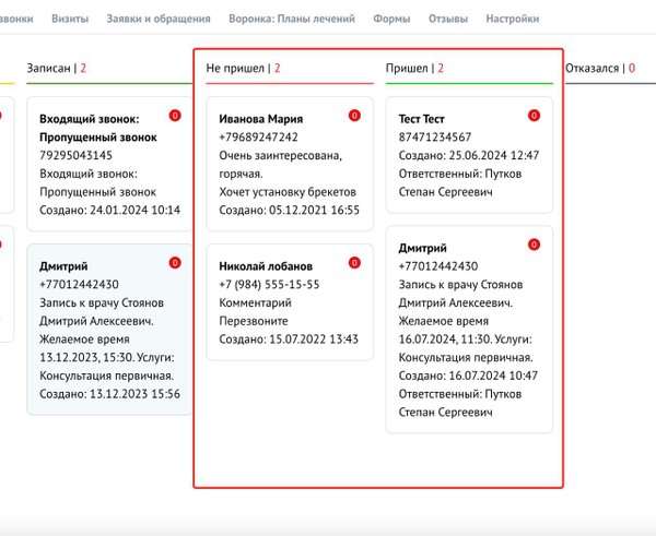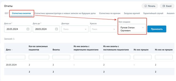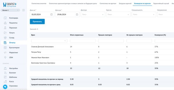 Это позволит увидеть сколько пациентов было записано определённым сотрудником за период, и их доходимость в клинику.