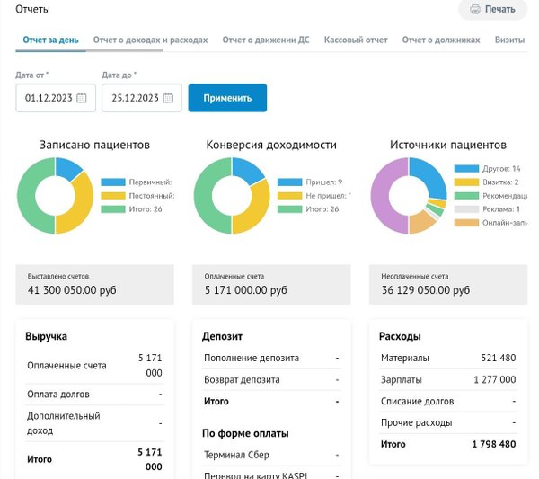 дин клик: Генерируйте отчеты о доходах и расходах за любые периоды. Анализ производительности: Отслеживайте эффективность работы сотрудников и выявляйте прибыльные услуги. Прогнозирование: Используйте исторические данные для планирования бюджета и ресурсов. Эти модули в CRM системе Dentist Plus представляют собой мощные инструменты для анализа и управления финансами, которые значительно упрощают работу стоматологических клиник и способствуют их росту.