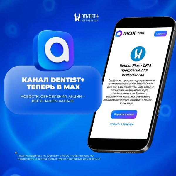 Dentist+ в мессенджере MAX! ️ Уважаемые пользователи, у нас отличная новость! Теперь все обновления, важные объявления, новые функции, улучшения и акции вы сможете получать и в мессенджере MAX. Мы запускаем свой официальный канал, чтобы вам было удобнее следить за изменениями и быть в курсе всего, что происходит в системе. Подписывайтесь на Dentist+ в MAX